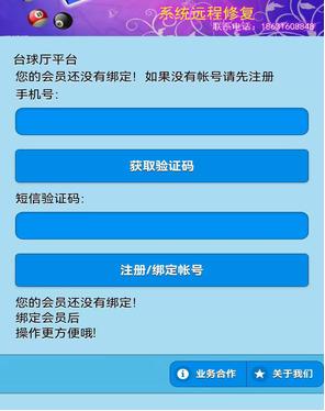 选择“台球->球厅登录”进入球厅注册/绑定界面。