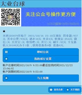 帐户绑定后在公众号下面菜单里选择。“台球->球厅登录”进入球厅管理显示本帐户下球厅列表。球厅列表最下面的球厅注册绑定用于绑定新的球厅。在我的帐号管理里可以管理帐号信息或是解绑此帐号与微信的绑定。